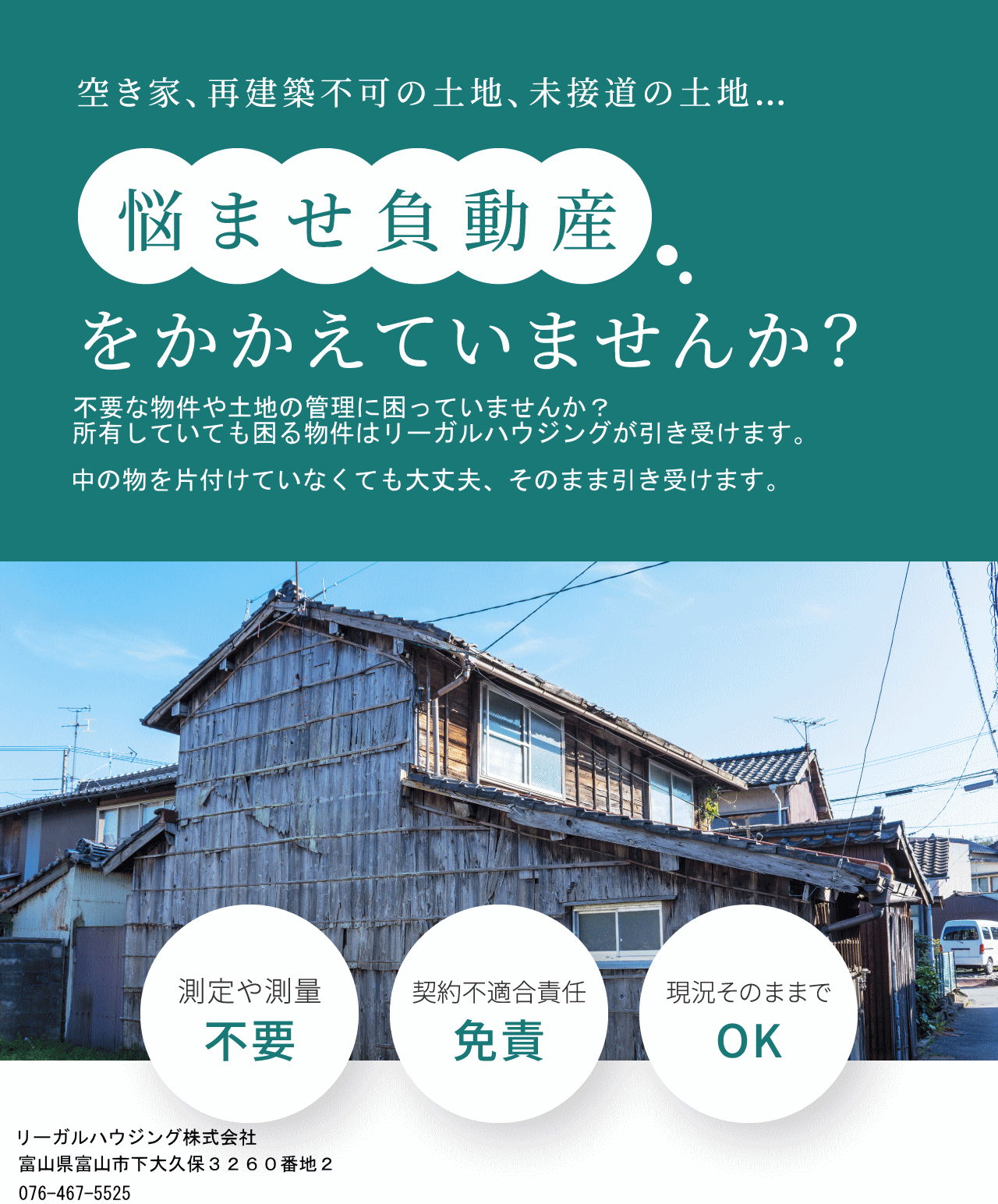 測量や境界明示は不要です。 契約不適合責任免責です。 中の物を片付ける必要はありません、現状そのままでOKです。 ※過疎地域の物件や敷地利用権のない建物などの場合には買取できない場合もあります。